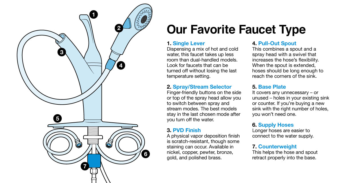 In the graphic below we highlight single-handle pullout faucets, a very popular style that combines a spray head and spout for convenience and flexibility. But our findings are applicable to other faucet styles too. Here's what else to consider when shopping for a new faucet.